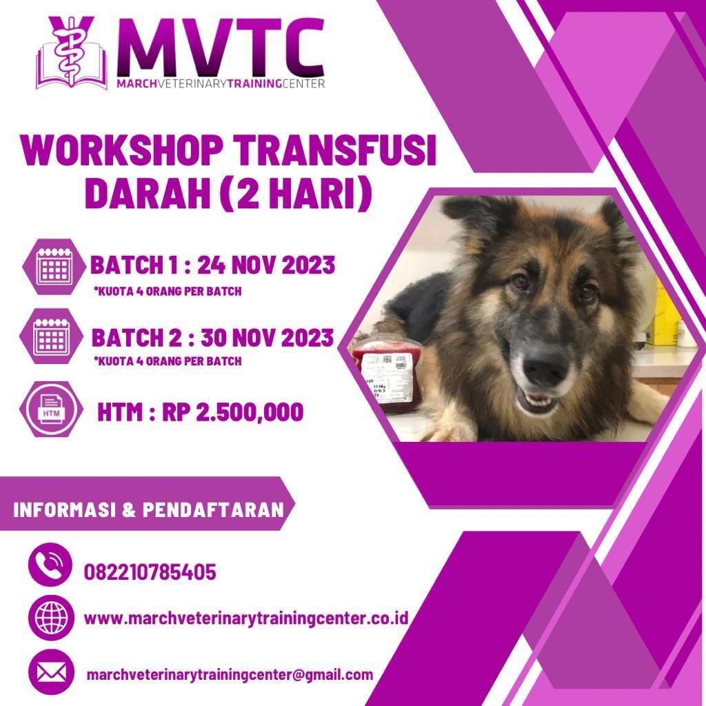 Workshop Transfusi Darah (2 hari) Materi latihan: 1 hari Teori dan Screening Lab 1 hari Praktek kucing dan anjing Kuota Terbatas 4 orang ️ Jadwal Workshop Batch 1 >> 24 November 2023 Batch 2 >> 30 November 2023 Fasilitas * …